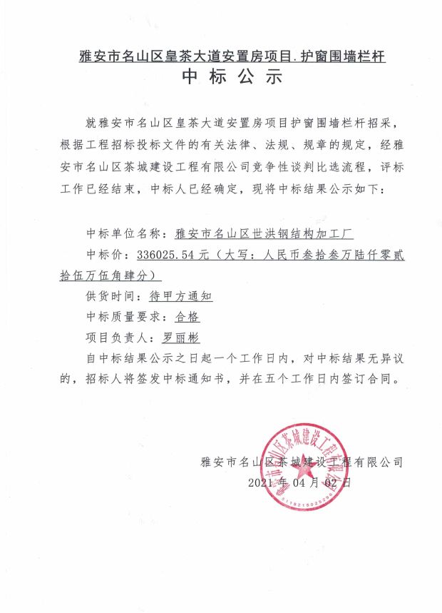 雅安市名山區(qū)皇茶大道安置房項目護(hù)窗圍墻欄桿中標(biāo)公示